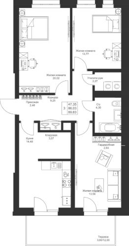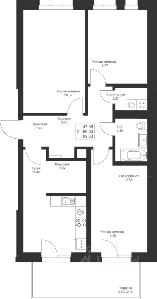 Продается 3-комнатная квартира 1 площадью 89,63 кв.м на 1 этаже в строящемся доме проекта "Новый свет" компании "Ак Барс Дом".