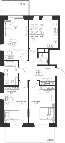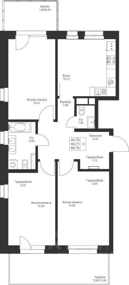 Продается 3-комнатная квартира 23 площадью 89,7 кв.м на 2 этаже в строящемся доме проекта "Новый свет" компании "Ак Барс Дом".
