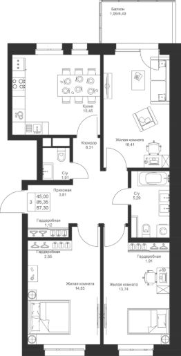 Продается 3-комнатная квартира 43 площадью 87,3 кв.м на 2 этаже в строящемся доме проекта "Новый свет" компании "Ак Барс Дом".