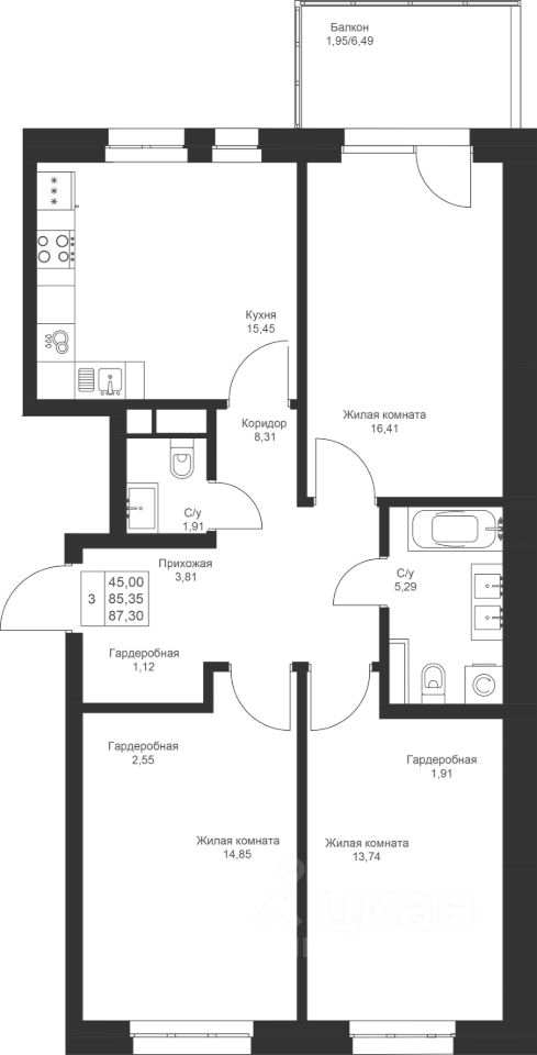 Комфортная 3-комнатная квартира с отдельной кухней и двумя санузлами. В квартире есть просторный балкон, где вы сможете организовать уютное место для отдыха.