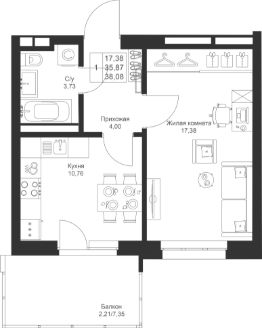 Уютная 1-комнатная квартира с отдельной кухней и выходом на балкон. Здесь можно организовать рабочее место или дополнительное пространство для отдыха.