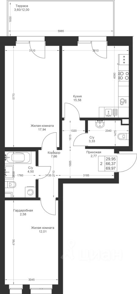 Продается 2-комнатная квартира 75 площадью 69,97 кв.м на 1 этаже в строящемся доме проекта "Новый свет" компании "Ак Барс Дом".