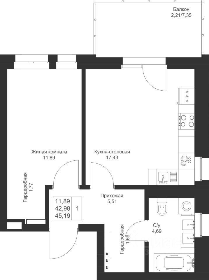 Продается 1-комнатная квартира 103 площадью 45,19 кв.м на 4 этаже в строящемся доме проекта "Новый свет" компании "Ак Барс Дом".
