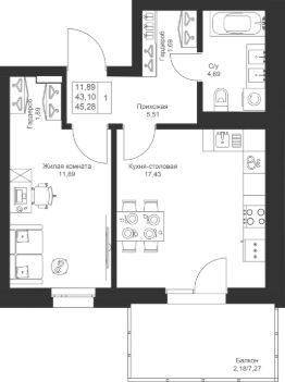 Продается 1-комнатная квартира 119 площадью 45,28 кв.м на 4 этаже в строящемся доме проекта "Новый свет" компании "Ак Барс Дом".