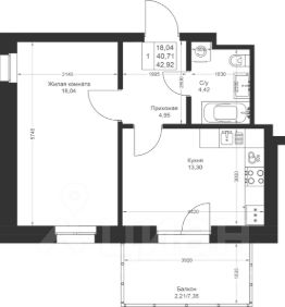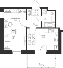 Продается 1-комнатная квартира 131 площадью 42,92 кв.м на 3 этаже в строящемся доме проекта "Новый свет" компании "Ак Барс Дом".