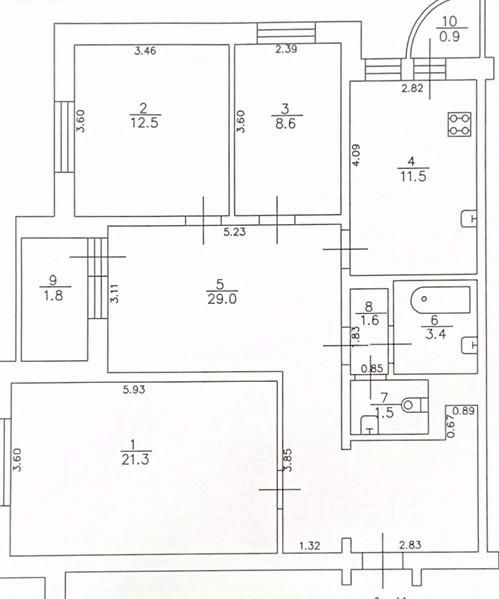 Общая площадь квартиры 89,4 кв.м , комнаты 21,3/12,5/8,6 , простроный холл 29 кв.м, кухня 11,5 кв.м.