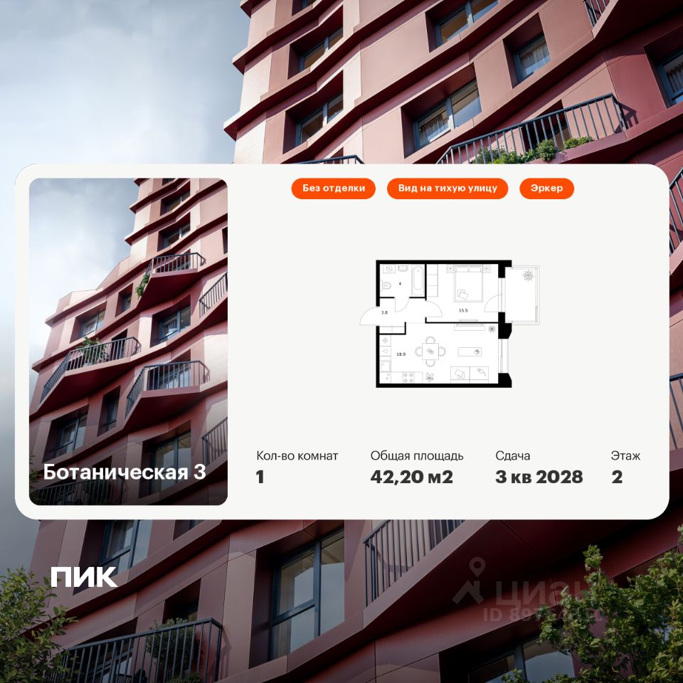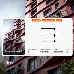 Продаётся 1-комн. квартира площадью 42,2 кв.м на 2 этаже 8 этажного дома (Корпус 1, Секция 1) проекта ПИК Ботаническая 3. Светлый просторный подъезд на уровне земли, функциональная планировка, большие окна, без отделки.