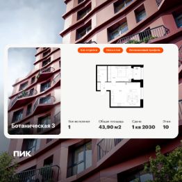 Продаётся 1-комн. квартира площадью 43,9 кв.м на 10 этаже 10 этажного дома (Корпус 2, Секция 8) проекта ПИК Ботаническая 3. Светлый просторный подъезд на уровне земли, функциональная планировка, большие окна, без отделки.