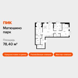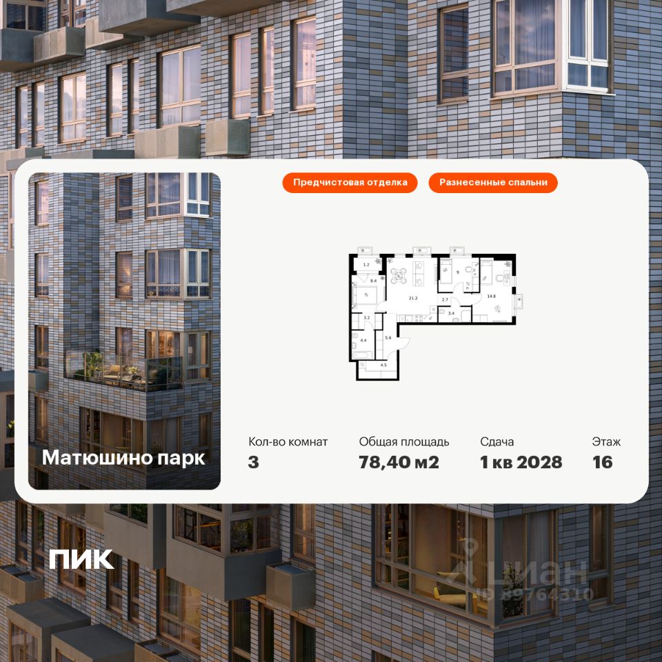 Продаётся 3-комн. квартира площадью 78,4 кв.м на 16 этаже 17 этажного дома (Корпус 3, Секция 1) проекта ПИК Матюшино парк. Светлый просторный подъезд на уровне земли, функциональная планировка, большие окна, предчистовая отделка.