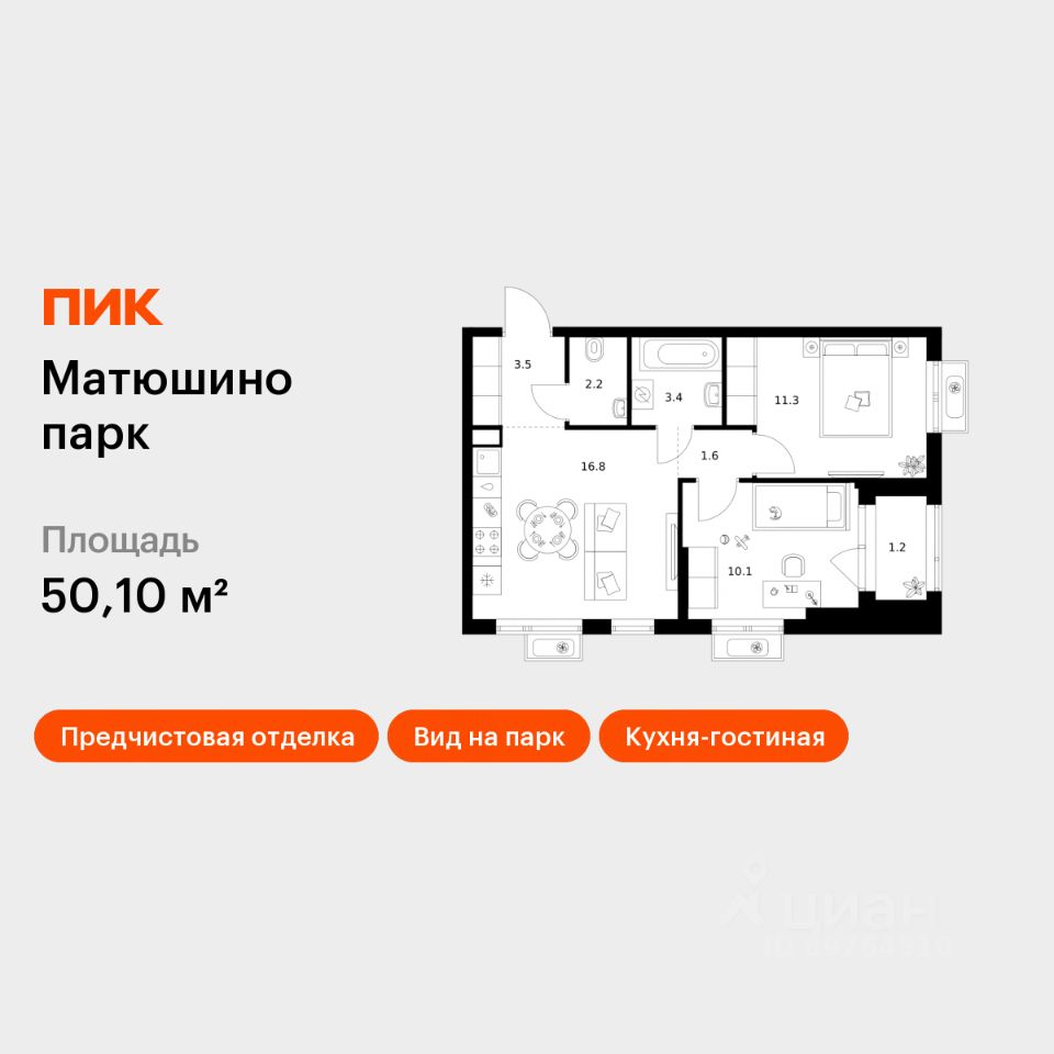 Продаётся 2-комн. квартира площадью 50,1 кв.м на 13 этаже 17 этажного дома (Корпус 3, Секция 1) проекта ПИК Матюшино парк. Светлый просторный подъезд на уровне земли, функциональная планировка, большие окна, предчистовая отделка.