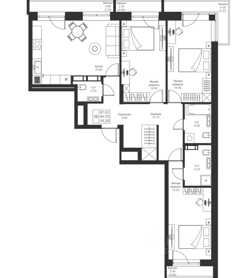 Продается 3-комнатная квартира 386 площадью 97,92 кв.м на 4 этаже в строящемся доме проекта "Мой Ритм" компании "Ак Барс Дом".