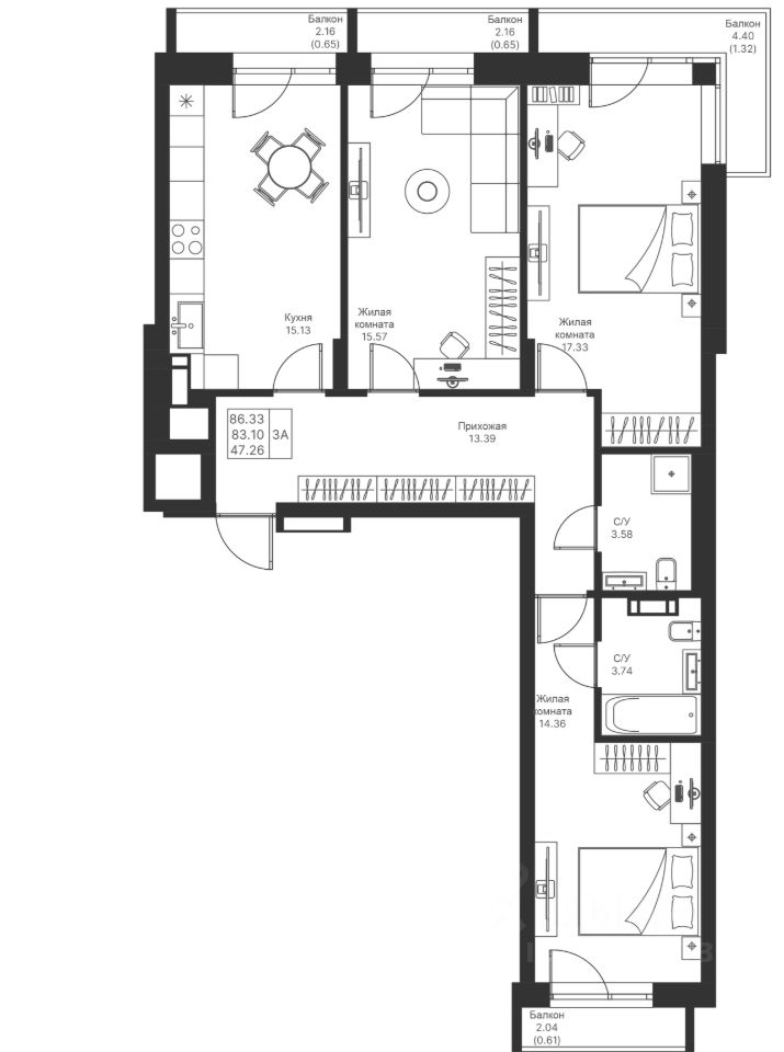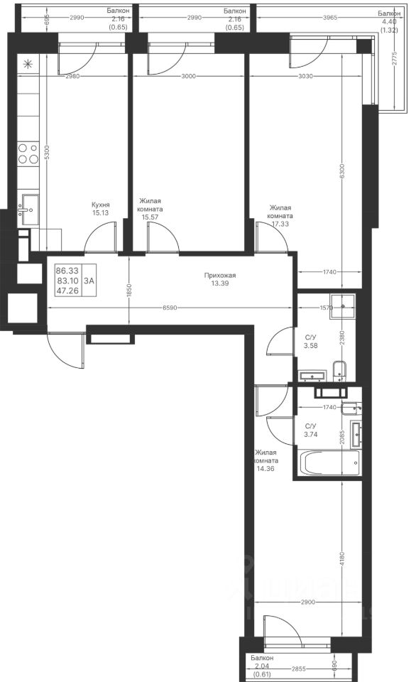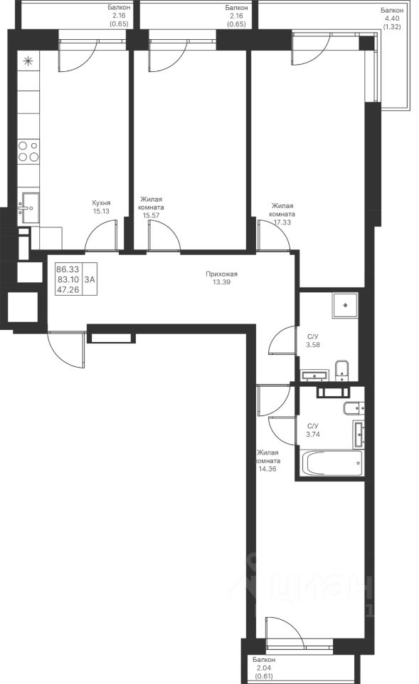 Продается 3-комнатная квартира 440 площадью 86,33 кв.м на 4 этаже в строящемся доме проекта "Мой Ритм" компании "Ак Барс Дом".
