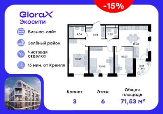 Продается 3-комн. квартира на 6-м этаже в строящемся проекте GloraX Экосити. Общая площадь лота составляет 71,53 кв. м, из которых 37,06 кв. м отведено под жилую и 16,36 кв. м под кухонную зону. Номер квартиры - 387