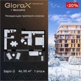 Продается 1-комн. квартира на 1-м этаже в строящемся проекте премиум-класса GloraX Premium Экосити. Общая площадь лота составляет 46,95 кв. м, из которых 12,95 кв. м отведено под жилую и 16,77 кв. м под кухонную зону. Номер квартиры - 4