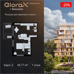 Продается 1-комн. квартира на 1-м этаже в строящемся проекте премиум-класса GloraX Premium Экосити. Общая площадь лота составляет 48,77 кв. м, из которых 13,67 кв. м отведено под жилую и 16,99 кв. м под кухонную зону. Номер квартиры - 5