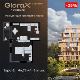 Продается 1-комн. квартира  на 5-м этаже в строящемся проекте премиум-класса GloraX Premium Экосити. Общая площадь лота составляет 46,73 кв. м, из которых 13,67 кв. м отведено под жилую и 16,99 кв. м под кухонную зону. Номер квартиры - 73