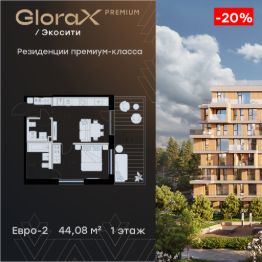 Продается 1-комн. квартира на 1-м этаже в строящемся проекте премиум-класса GloraX Premium Экосити. Общая площадь лота составляет 44,08 кв. м, из которых 12,27 кв. м отведено под жилую и 15,80 кв. м под кухонную зону. Номер квартиры - 165