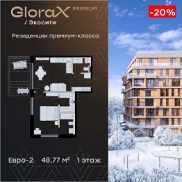 Продается 1-комн. квартира на 1-м этаже в строящемся проекте премиум-класса GloraX Premium Экосити. Общая площадь лота составляет 48,77 кв. м, из которых 13,67 кв. м отведено под жилую и 16,99 кв. м под кухонную зону. Номер квартиры - 167