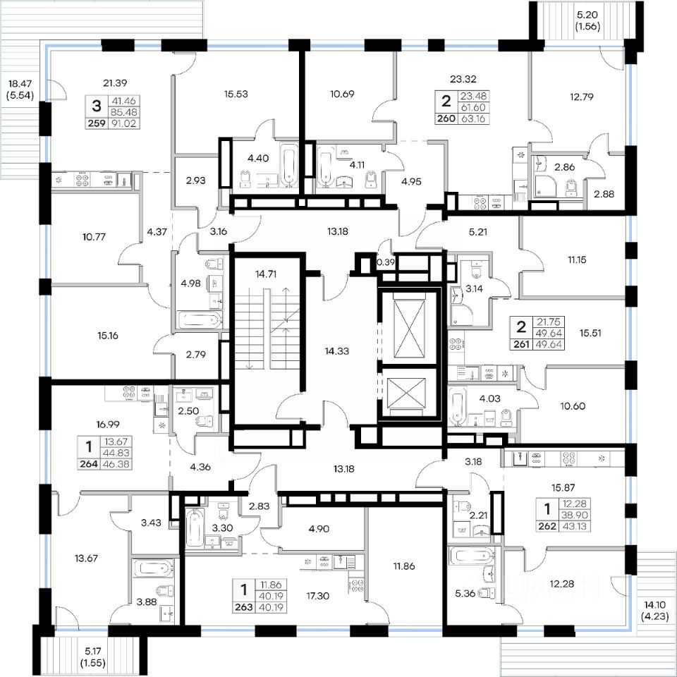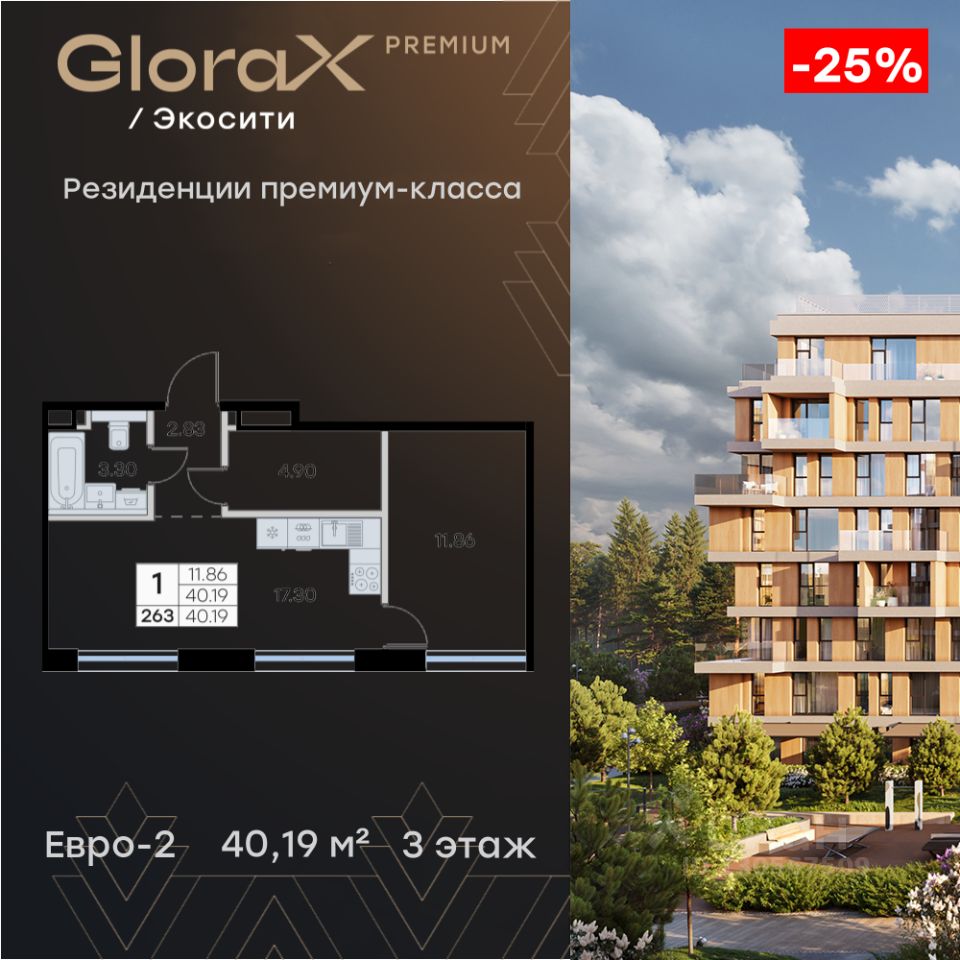 Продается 1-комн. квартира на 3-м этаже в строящемся проекте премиум-класса GloraX Premium Экосити. Общая площадь лота составляет 40,19 кв. м, из которых 11,86 кв. м отведено под жилую и 17,30 кв. м под кухонную зону. Номер квартиры - 263
