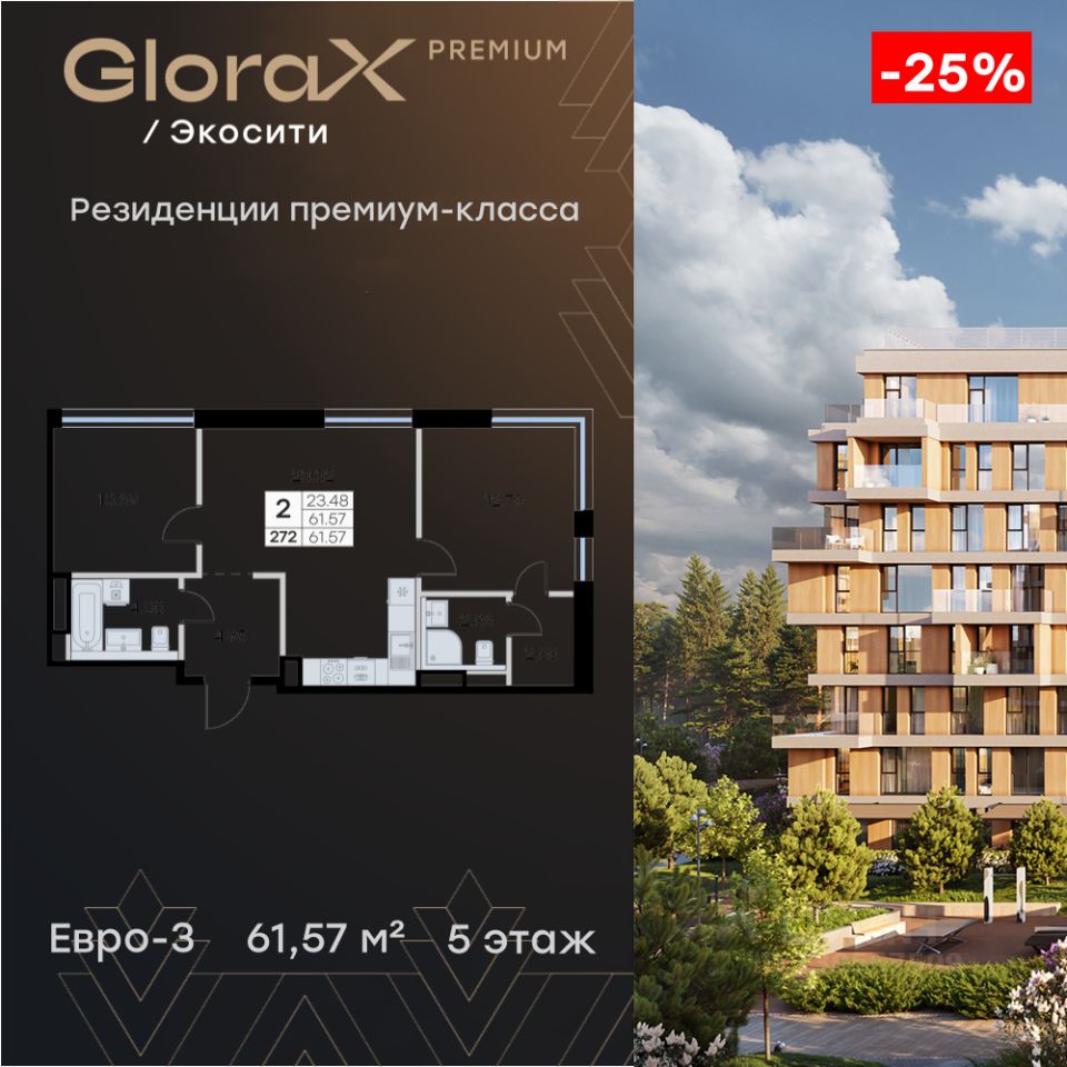 Продается 2-комн. квартира на 5-м этаже в строящемся проекте премиум-класса GloraX Premium Экосити. Общая площадь лота составляет 61,57 кв. м, из которых 23,48 кв. м отведено под жилую и 23,32 кв. м под кухонную зону. Номер квартиры - 272