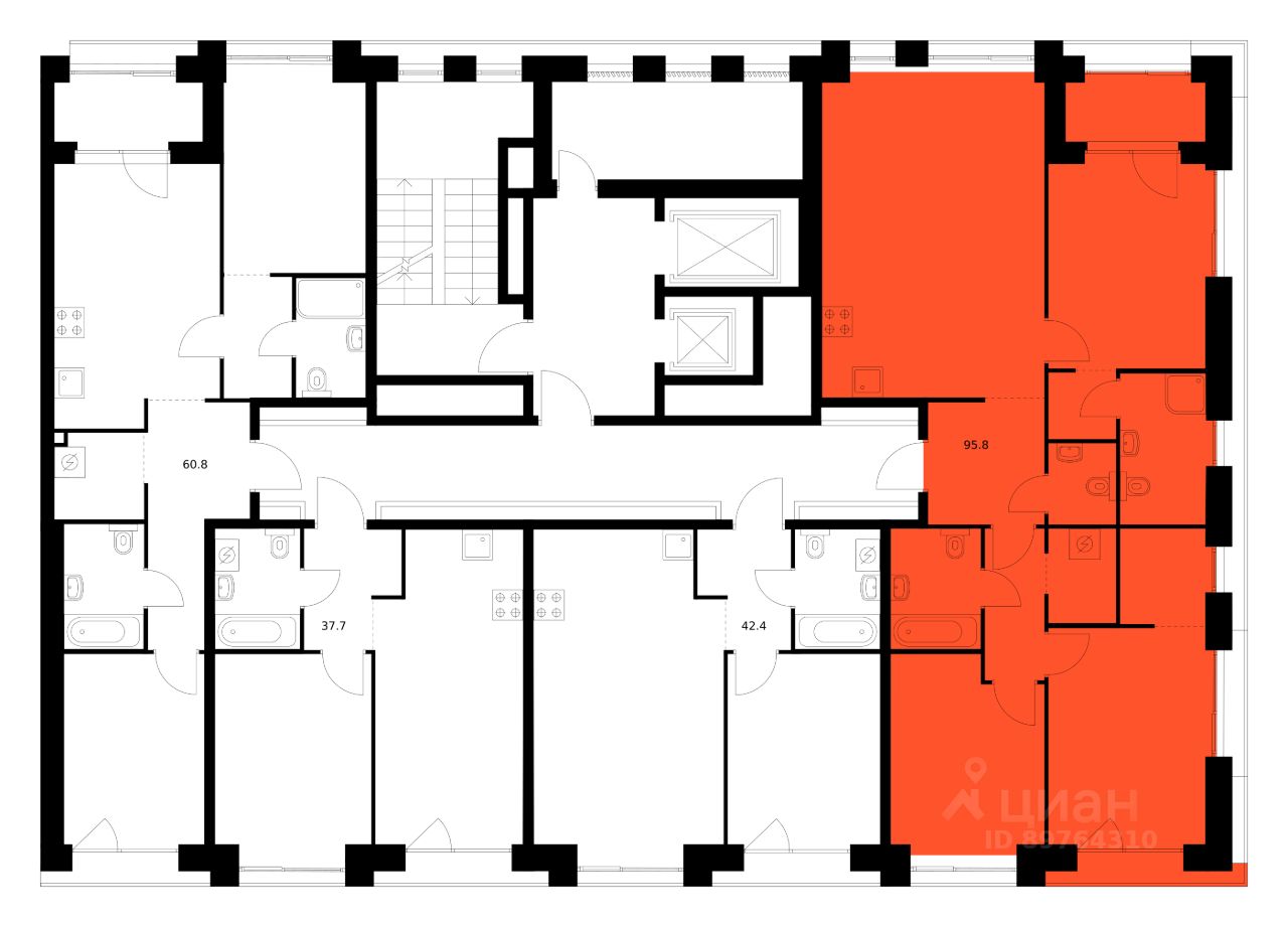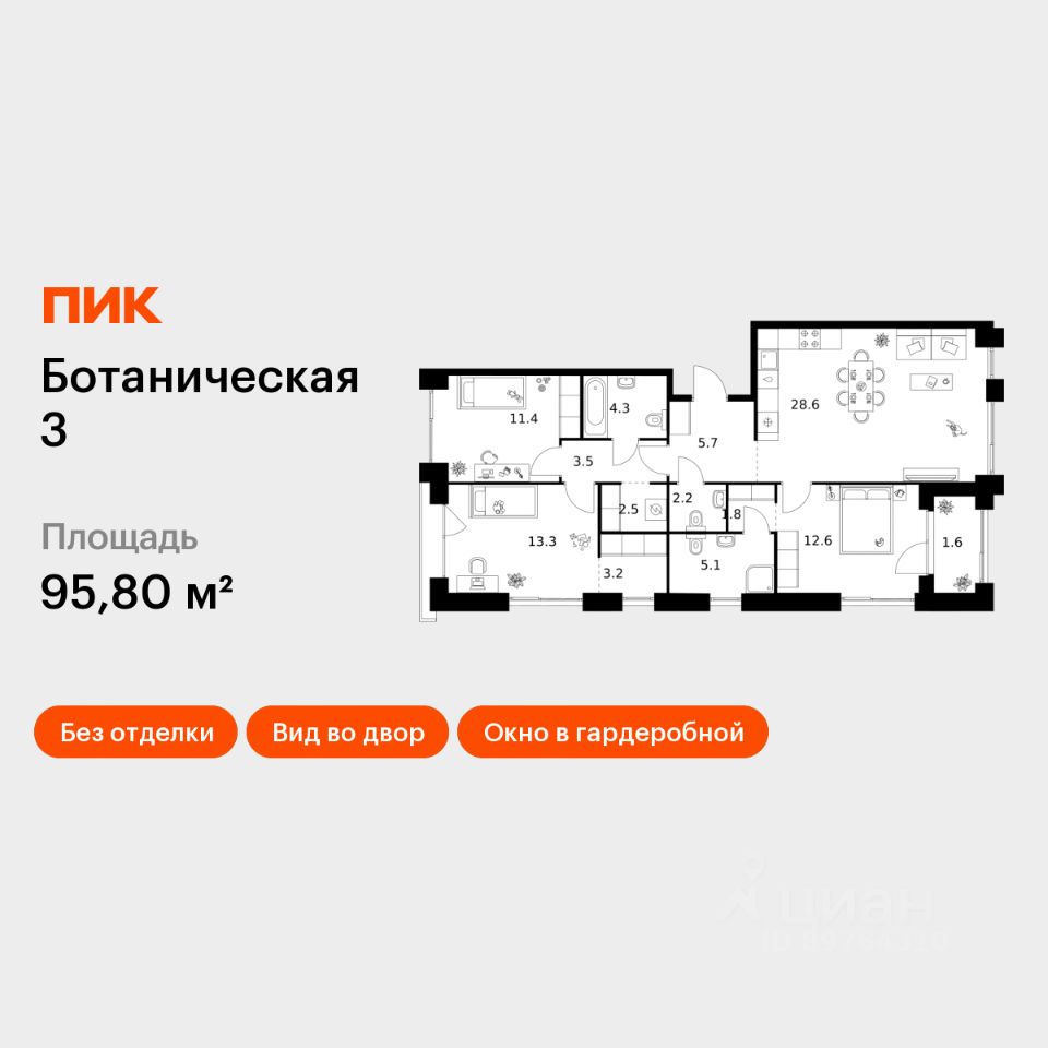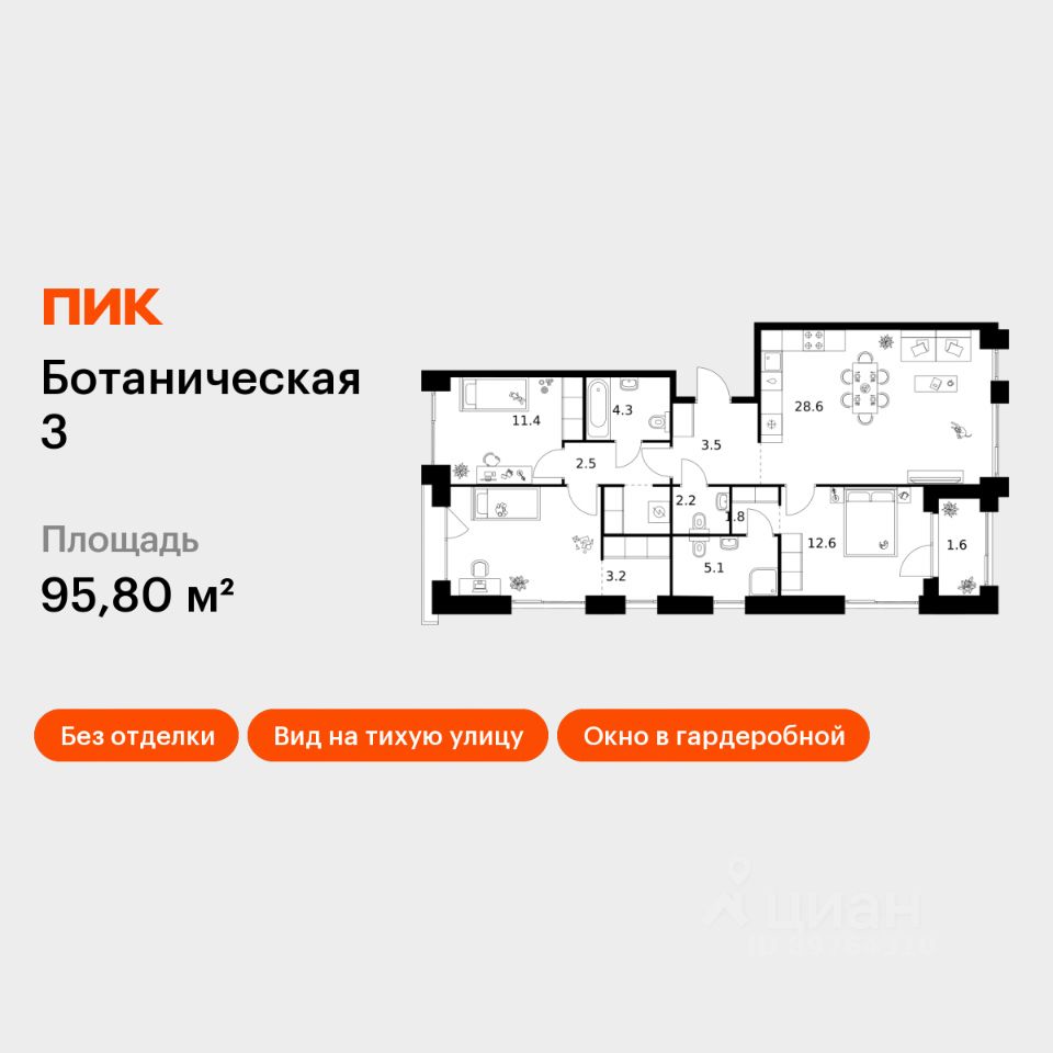 Продаётся 3-комн. квартира площадью 95,8 кв.м на 9 этаже 10 этажного дома (Корпус 2, Секция 7) проекта ПИК Ботаническая 3. Светлый просторный подъезд на уровне земли, функциональная планировка, большие окна, без отделки.