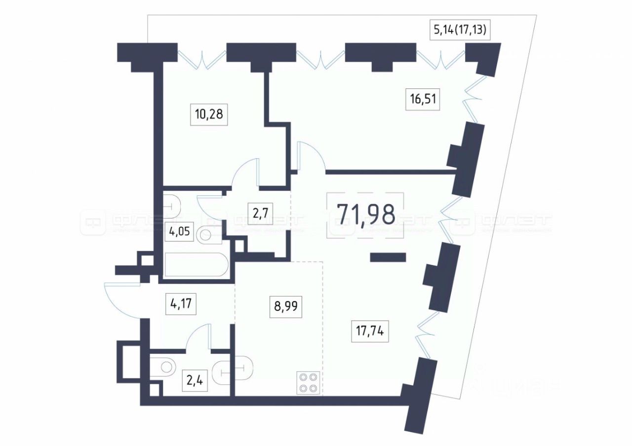 Общая площадь - 71,98 м2.Гостиная - 17,74 м2.