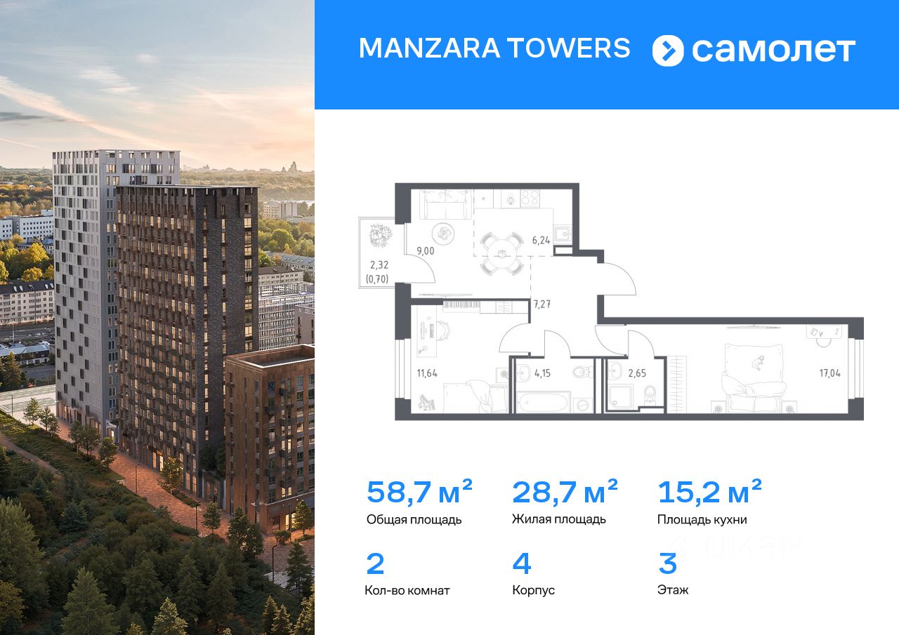 Предлагается 2-комнатная квартира комфорт-класса 58,69 кв.м в корпусе 4 на 3 этаже, в MANZARA TOWERS