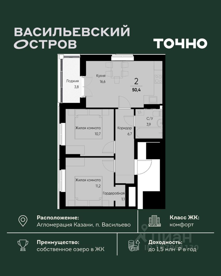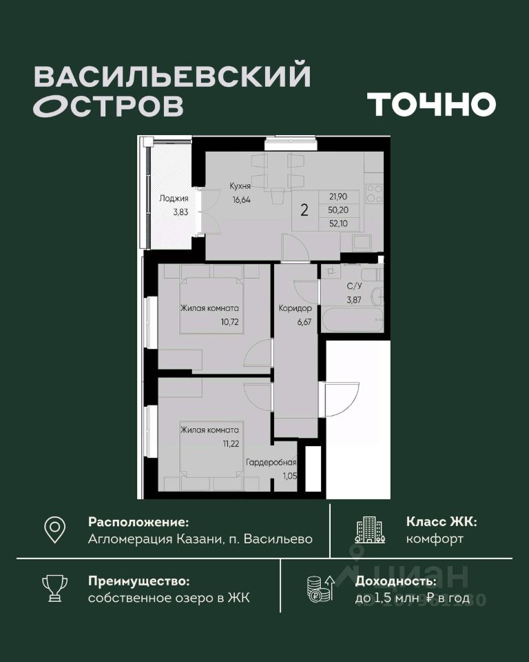 ЖК "Васильевский остров" — масштабный проект ТОЧНО в Казанской агломерации. Просторная территория 88 Га спроектирована для комфортной жизни: озеро с набережной и пляжем, каток, зелёные маршруты. В проекте комплекса — школа на 1 224 места, 2 детских сада на 680 мест, детская и взрослая поликлиники, фитнес-центр с бассейном, термальный комплекс, фермерский рынок, магазины, кафе и рестораны.
