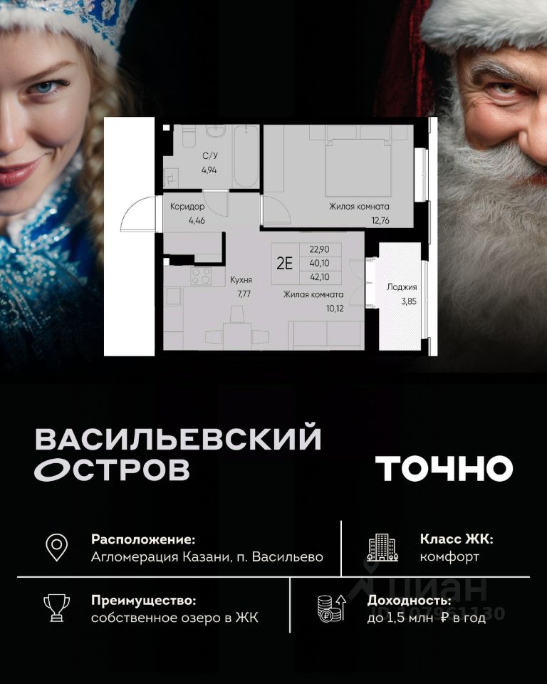 ЖК "Васильевский остров" — масштабный проект ТОЧНО в Казанской агломерации. Просторная территория 88 Га спроектирована для комфортной жизни: озеро с набережной и пляжем, каток, зелёные маршруты. В проекте комплекса — школа на 1 224 места, 2 детских сада на 680 мест, детская и взрослая поликлиники, фитнес-центр с бассейном, термальный комплекс, фермерский рынок, магазины, кафе и рестораны.