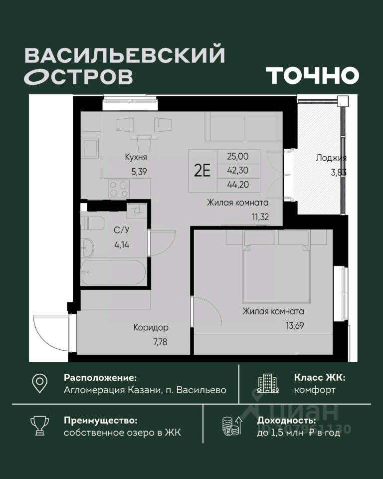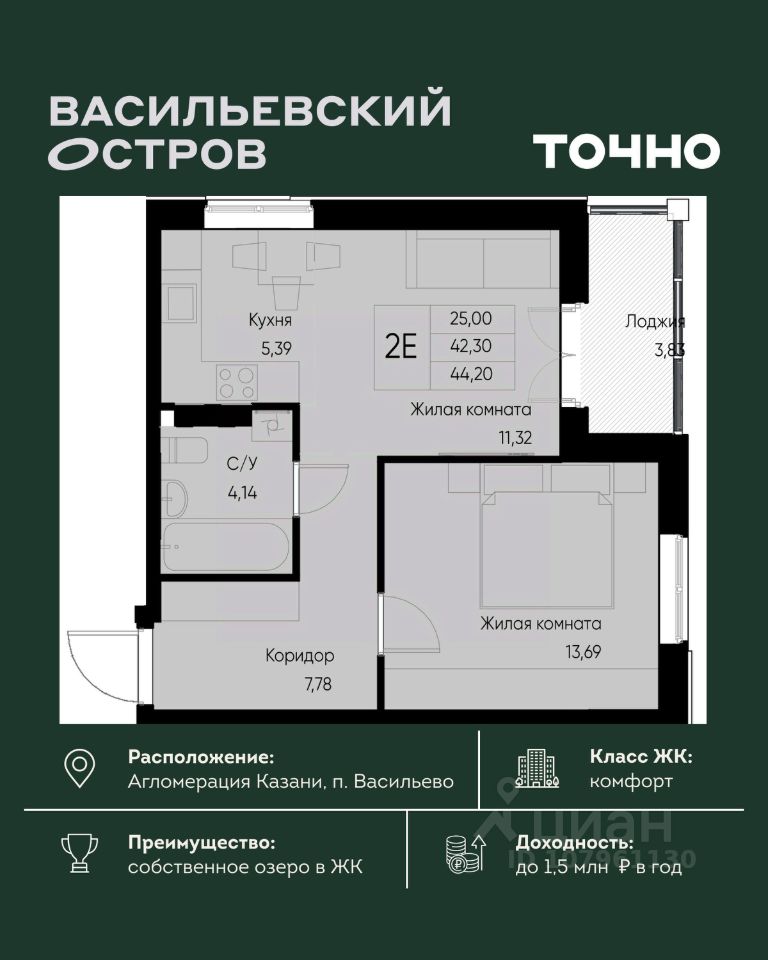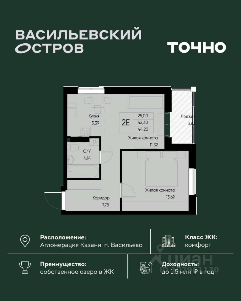 ЖК "Васильевский остров" — масштабный проект ТОЧНО в Казанской агломерации. Просторная территория 88 Га спроектирована для комфортной жизни: озеро с набережной и пляжем, каток, зелёные маршруты. В проекте комплекса — школа на 1 224 места, 2 детских сада на 680 мест, детская и взрослая поликлиники, фитнес-центр с бассейном, термальный комплекс, фермерский рынок, магазины, кафе и рестораны.