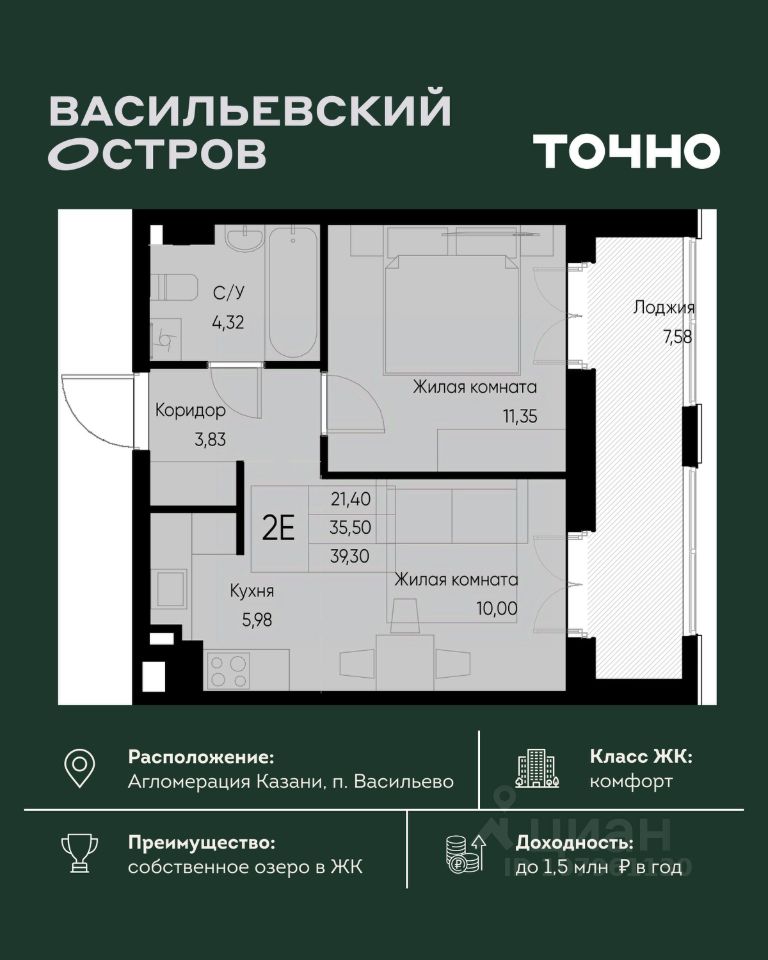 ЖК "Васильевский остров" — масштабный проект ТОЧНО в Казанской агломерации. Просторная территория 88 Га спроектирована для комфортной жизни: озеро с набережной и пляжем, каток, зелёные маршруты. В проекте комплекса — школа на 1 224 места, 2 детских сада на 680 мест, детская и взрослая поликлиники, фитнес-центр с бассейном, термальный комплекс, фермерский рынок, магазины, кафе и рестораны.