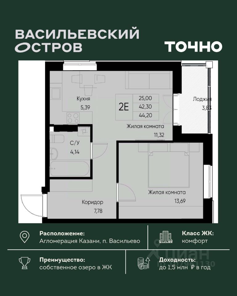 ЖК "Васильевский остров" — масштабный проект ТОЧНО в Казанской агломерации. Просторная территория 88 Га спроектирована для комфортной жизни: озеро с набережной и пляжем, каток, зелёные маршруты. В проекте комплекса — школа на 1 224 места, 2 детских сада на 680 мест, детская и взрослая поликлиники, фитнес-центр с бассейном, термальный комплекс, фермерский рынок, магазины, кафе и рестораны.