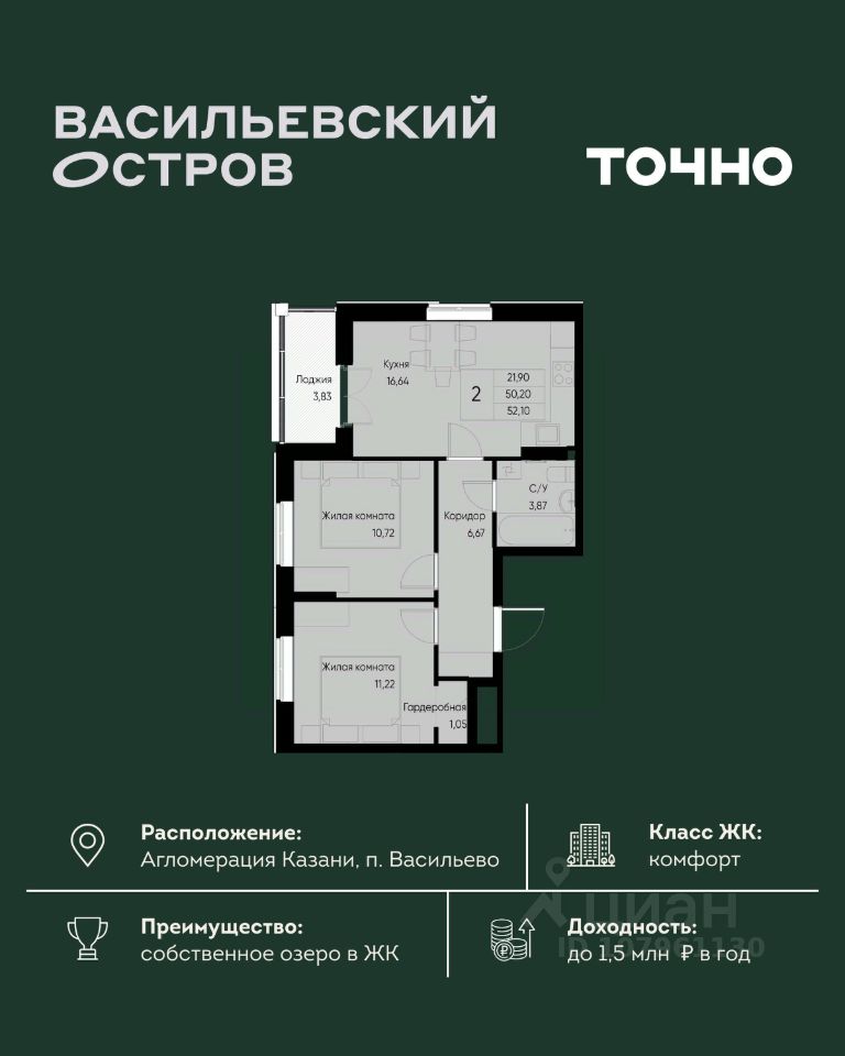 ЖК "Васильевский остров" — масштабный проект ТОЧНО в Казанской агломерации. Просторная территория 88 Га спроектирована для комфортной жизни: озеро с набережной и пляжем, каток, зелёные маршруты. В проекте комплекса — школа на 1 224 места, 2 детских сада на 680 мест, детская и взрослая поликлиники, фитнес-центр с бассейном, термальный комплекс, фермерский рынок, магазины, кафе и рестораны.