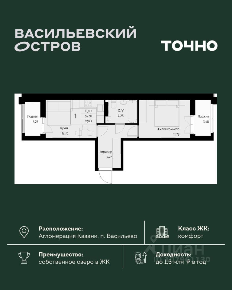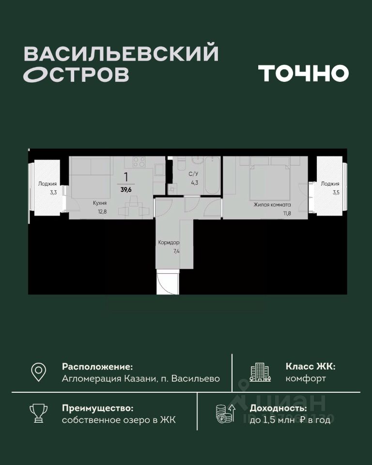 ЖК "Васильевский остров" — масштабный проект ТОЧНО в Казанской агломерации. Просторная территория 88 Га спроектирована для комфортной жизни: озеро с набережной и пляжем, каток, зелёные маршруты. В проекте комплекса — школа на 1 224 места, 2 детских сада на 680 мест, детская и взрослая поликлиники, фитнес-центр с бассейном, термальный комплекс, фермерский рынок, магазины, кафе и рестораны.