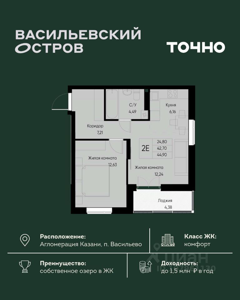 ЖК "Васильевский остров" — масштабный проект ТОЧНО в Казанской агломерации. Просторная территория 88 Га спроектирована для комфортной жизни: озеро с набережной и пляжем, каток, зелёные маршруты. В проекте комплекса — школа на 1 224 места, 2 детских сада на 680 мест, детская и взрослая поликлиники, фитнес-центр с бассейном, термальный комплекс, фермерский рынок, магазины, кафе и рестораны.