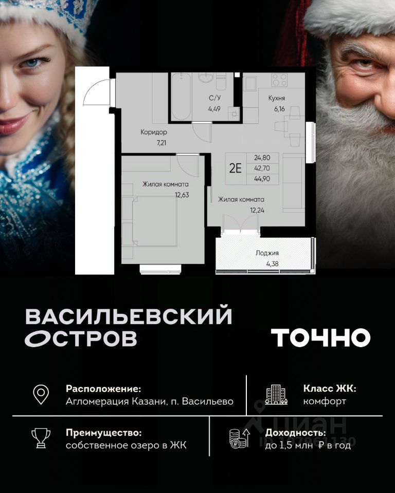 ЖК "Васильевский остров" — масштабный проект ТОЧНО в Казанской агломерации. Просторная территория 88 Га спроектирована для комфортной жизни: озеро с набережной и пляжем, каток, зелёные маршруты. В проекте комплекса — школа на 1 224 места, 2 детских сада на 680 мест, детская и взрослая поликлиники, фитнес-центр с бассейном, термальный комплекс, фермерский рынок, магазины, кафе и рестораны.