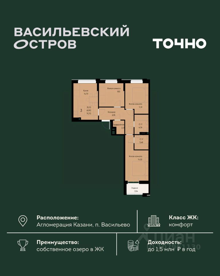 ЖК "Васильевский остров" — масштабный проект ТОЧНО в Казанской агломерации. Просторная территория 88 Га спроектирована для комфортной жизни: озеро с набережной и пляжем, каток, зелёные маршруты. В проекте комплекса — школа на 1 224 места, 2 детских сада на 680 мест, детская и взрослая поликлиники, фитнес-центр с бассейном, термальный комплекс, фермерский рынок, магазины, кафе и рестораны.