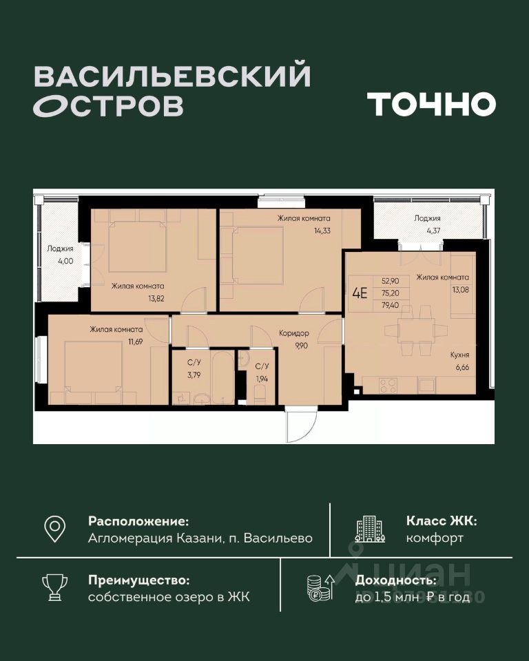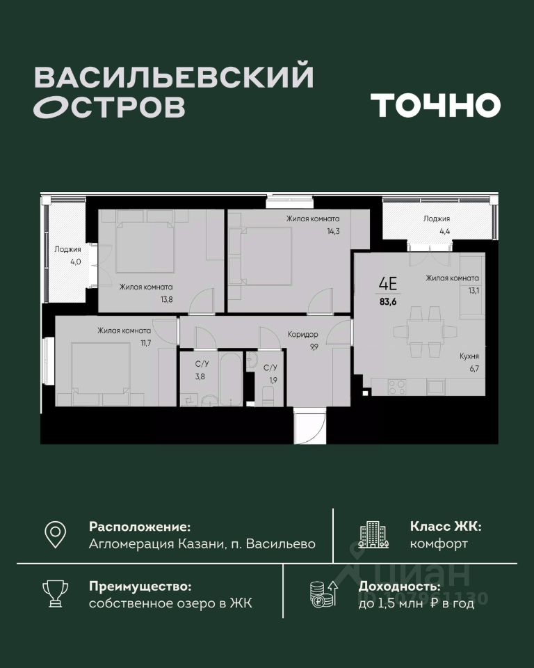 ЖК "Васильевский остров" — масштабный проект ТОЧНО в Казанской агломерации. Просторная территория 88 Га спроектирована для комфортной жизни: озеро с набережной и пляжем, каток, зелёные маршруты. В проекте комплекса — школа на 1 224 места, 2 детских сада на 680 мест, детская и взрослая поликлиники, фитнес-центр с бассейном, термальный комплекс, фермерский рынок, магазины, кафе и рестораны.