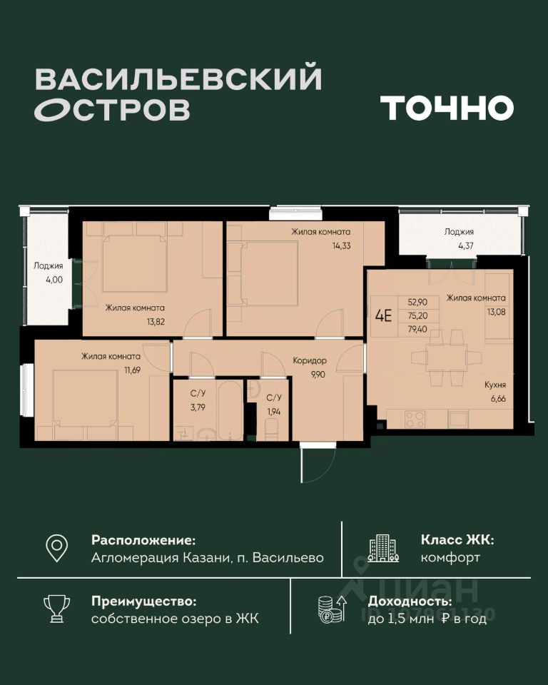 ЖК "Васильевский остров" — масштабный проект ТОЧНО в Казанской агломерации. Просторная территория 88 Га спроектирована для комфортной жизни: озеро с набережной и пляжем, каток, зелёные маршруты. В проекте комплекса — школа на 1 224 места, 2 детских сада на 680 мест, детская и взрослая поликлиники, фитнес-центр с бассейном, термальный комплекс, фермерский рынок, магазины, кафе и рестораны.
