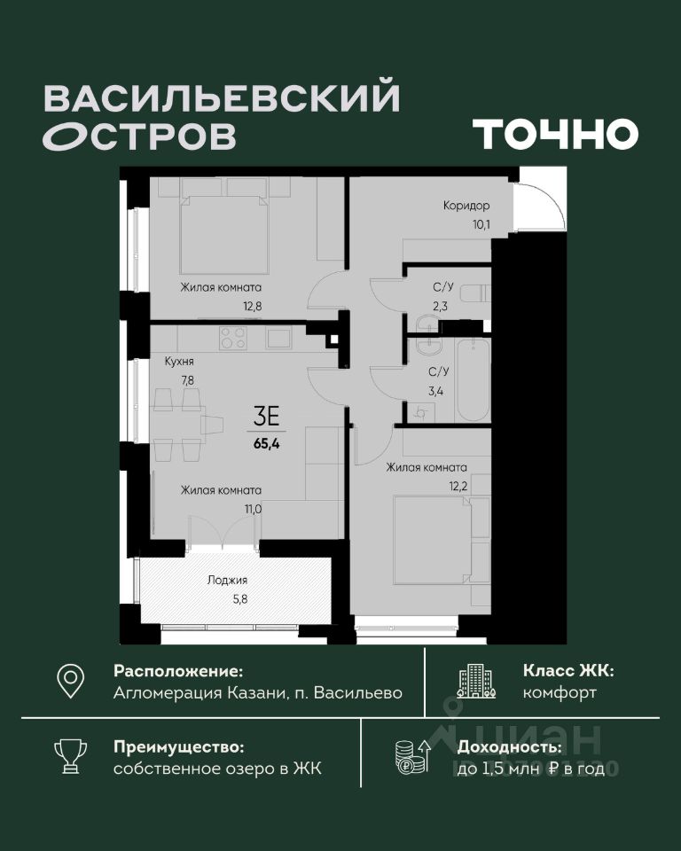 ЖК "Васильевский остров" — масштабный проект ТОЧНО в Казанской агломерации. Просторная территория 88 Га спроектирована для комфортной жизни: озеро с набережной и пляжем, каток, зелёные маршруты. В проекте комплекса — школа на 1 224 места, 2 детских сада на 680 мест, детская и взрослая поликлиники, фитнес-центр с бассейном, термальный комплекс, фермерский рынок, магазины, кафе и рестораны.