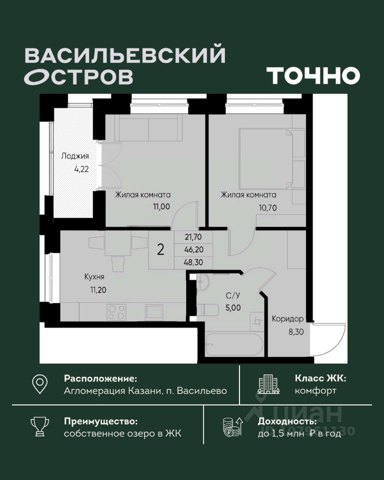 ЖК "Васильевский остров" — масштабный проект ТОЧНО в Казанской агломерации. Просторная территория 88 Га спроектирована для комфортной жизни: озеро с набережной и пляжем, каток, зелёные маршруты. В проекте комплекса — школа на 1 224 места, 2 детских сада на 680 мест, детская и взрослая поликлиники, фитнес-центр с бассейном, термальный комплекс, фермерский рынок, магазины, кафе и рестораны.
