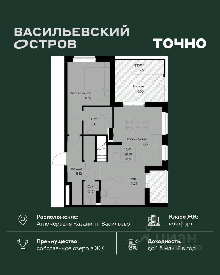 ЖК "Васильевский остров" — масштабный проект ТОЧНО в Казанской агломерации. Просторная территория 88 Га спроектирована для комфортной жизни: озеро с набережной и пляжем, каток, зелёные маршруты. В проекте комплекса — школа на 1 224 места, 2 детских сада на 680 мест, детская и взрослая поликлиники, фитнес-центр с бассейном, термальный комплекс, фермерский рынок, магазины, кафе и рестораны.