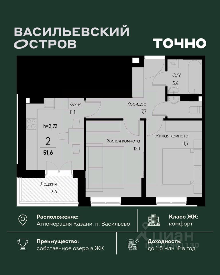 ЖК "Васильевский остров" — масштабный проект ТОЧНО в Казанской агломерации. Просторная территория 88 Га спроектирована для комфортной жизни: озеро с набережной и пляжем, каток, зелёные маршруты. В проекте комплекса — школа на 1 224 места, 2 детских сада на 680 мест, детская и взрослая поликлиники, фитнес-центр с бассейном, термальный комплекс, фермерский рынок, магазины, кафе и рестораны.