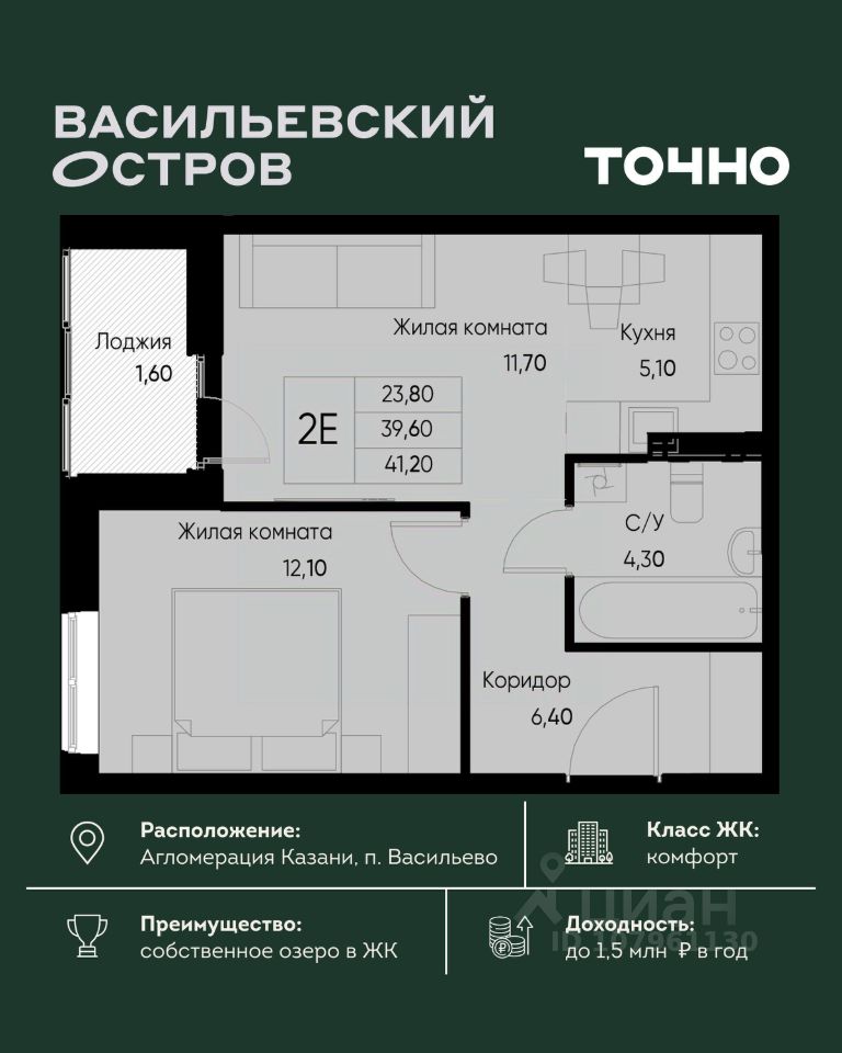 ЖК "Васильевский остров" — масштабный проект ТОЧНО в Казанской агломерации. Просторная территория 88 Га спроектирована для комфортной жизни: озеро с набережной и пляжем, каток, зелёные маршруты. В проекте комплекса — школа на 1 224 места, 2 детских сада на 680 мест, детская и взрослая поликлиники, фитнес-центр с бассейном, термальный комплекс, фермерский рынок, магазины, кафе и рестораны.