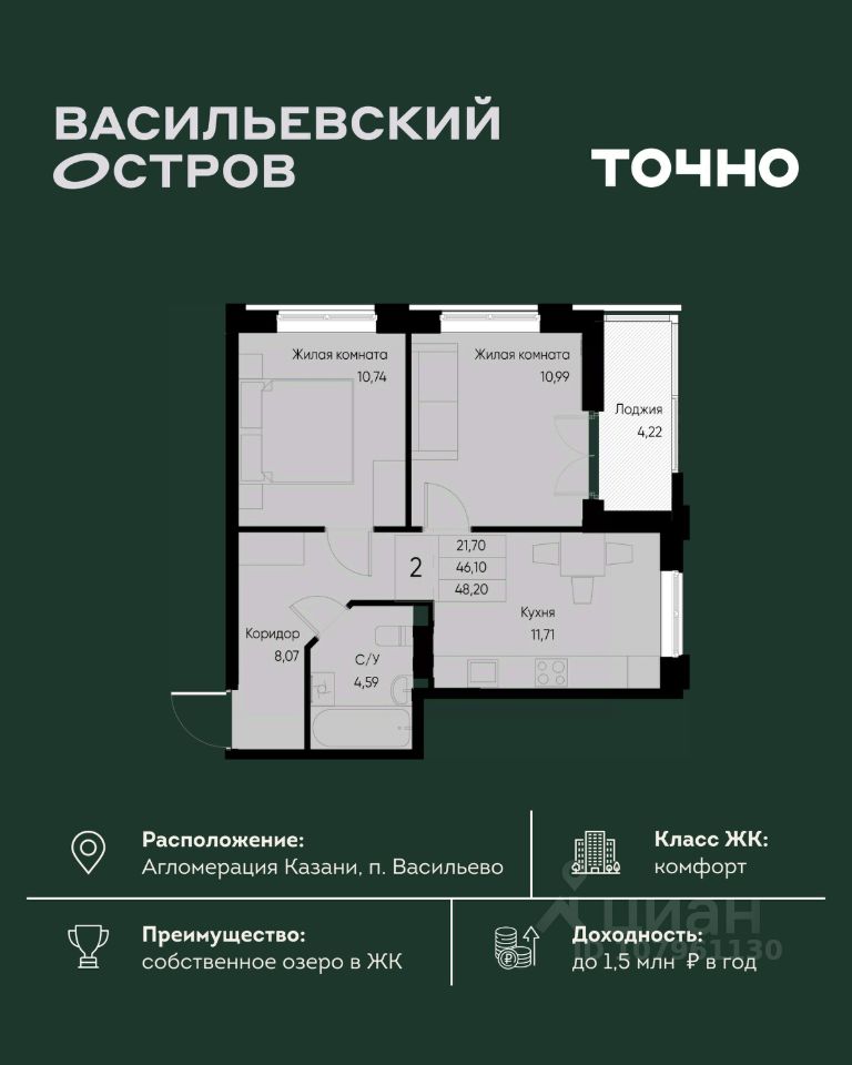 ЖК "Васильевский остров" — масштабный проект ТОЧНО в Казанской агломерации. Просторная территория 88 Га спроектирована для комфортной жизни: озеро с набережной и пляжем, каток, зелёные маршруты. В проекте комплекса — школа на 1 224 места, 2 детских сада на 680 мест, детская и взрослая поликлиники, фитнес-центр с бассейном, термальный комплекс, фермерский рынок, магазины, кафе и рестораны.