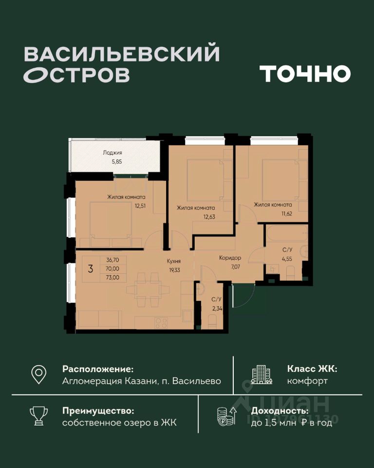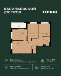 ЖК "Васильевский остров" — масштабный проект ТОЧНО в Казанской агломерации. Просторная территория 88 Га спроектирована для комфортной жизни: озеро с набережной и пляжем, каток, зелёные маршруты. В проекте комплекса — школа на 1 224 места, 2 детских сада на 680 мест, детская и взрослая поликлиники, фитнес-центр с бассейном, термальный комплекс, фермерский рынок, магазины, кафе и рестораны.