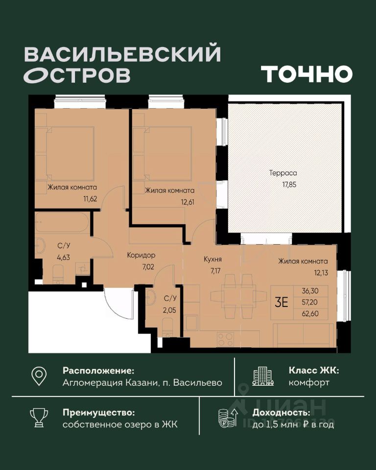 ЖК "Васильевский остров" — масштабный проект ТОЧНО в Казанской агломерации. Просторная территория 88 Га спроектирована для комфортной жизни: озеро с набережной и пляжем, каток, зелёные маршруты. В проекте комплекса — школа на 1 224 места, 2 детских сада на 680 мест, детская и взрослая поликлиники, фитнес-центр с бассейном, термальный комплекс, фермерский рынок, магазины, кафе и рестораны.
