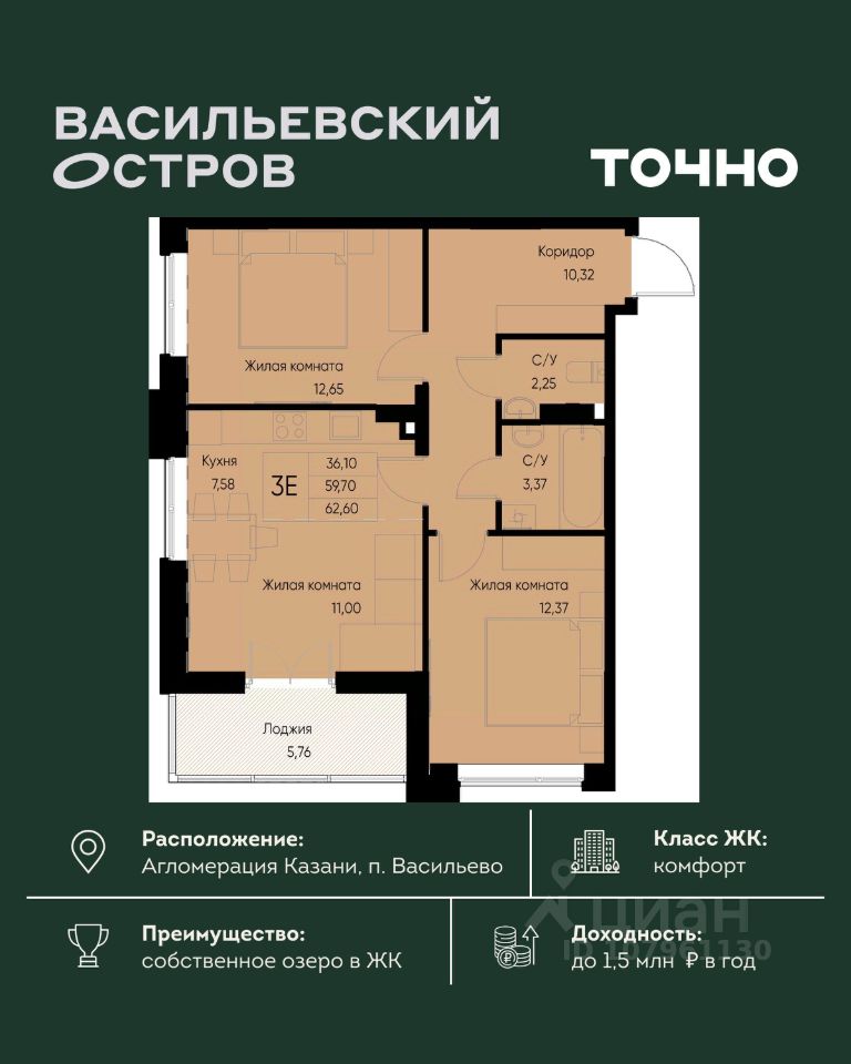 ЖК "Васильевский остров" — масштабный проект ТОЧНО в Казанской агломерации. Просторная территория 88 Га спроектирована для комфортной жизни: озеро с набережной и пляжем, каток, зелёные маршруты. В проекте комплекса — школа на 1 224 места, 2 детских сада на 680 мест, детская и взрослая поликлиники, фитнес-центр с бассейном, термальный комплекс, фермерский рынок, магазины, кафе и рестораны.