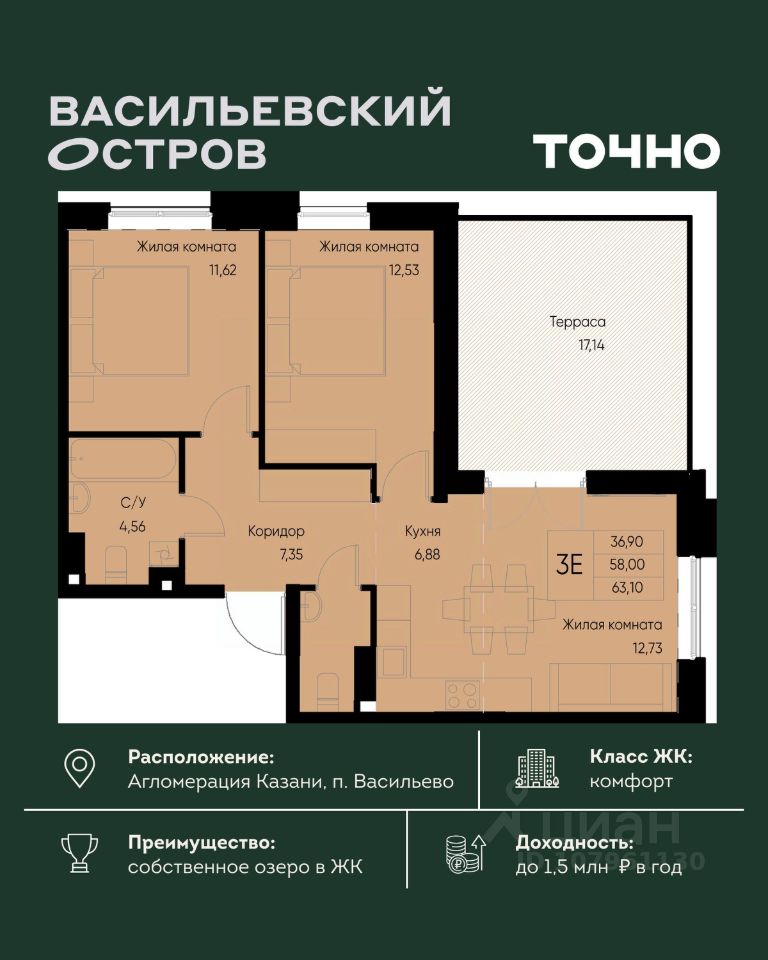 ЖК "Васильевский остров" — масштабный проект ТОЧНО в Казанской агломерации. Просторная территория 88 Га спроектирована для комфортной жизни: озеро с набережной и пляжем, каток, зелёные маршруты. В проекте комплекса — школа на 1 224 места, 2 детских сада на 680 мест, детская и взрослая поликлиники, фитнес-центр с бассейном, термальный комплекс, фермерский рынок, магазины, кафе и рестораны.