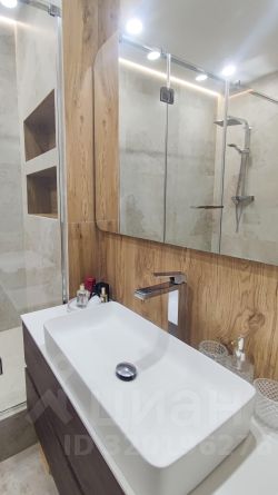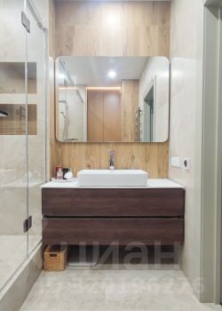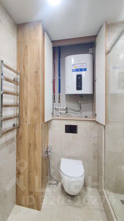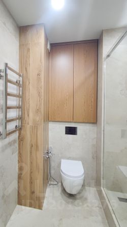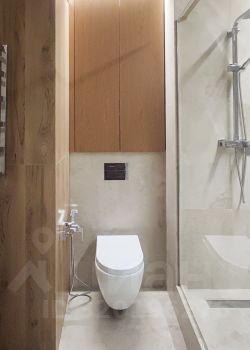 Санузел с большой душевой, водонагреватель спрятан в шкафу над инсталляцией, полы теплые.